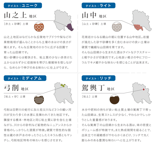 山之上地区はなだらかな丘陵地でブドウや梨などの 果樹栽培が盛んなことからも土壌の水はけの良さが 窺えます。 そんな丘陵地のかかりに広がる田圃で 育 っ た 山 田 錦 で す。 粗い砂礫からは軽快さを、粘土質の少ない赤茶けた 土からはわずかに収斂味を帯びた複雑味を宿しなが ら、 なめらかで伸びのある味わいに仕上がります。